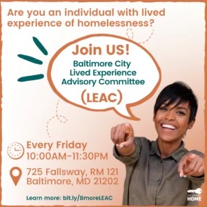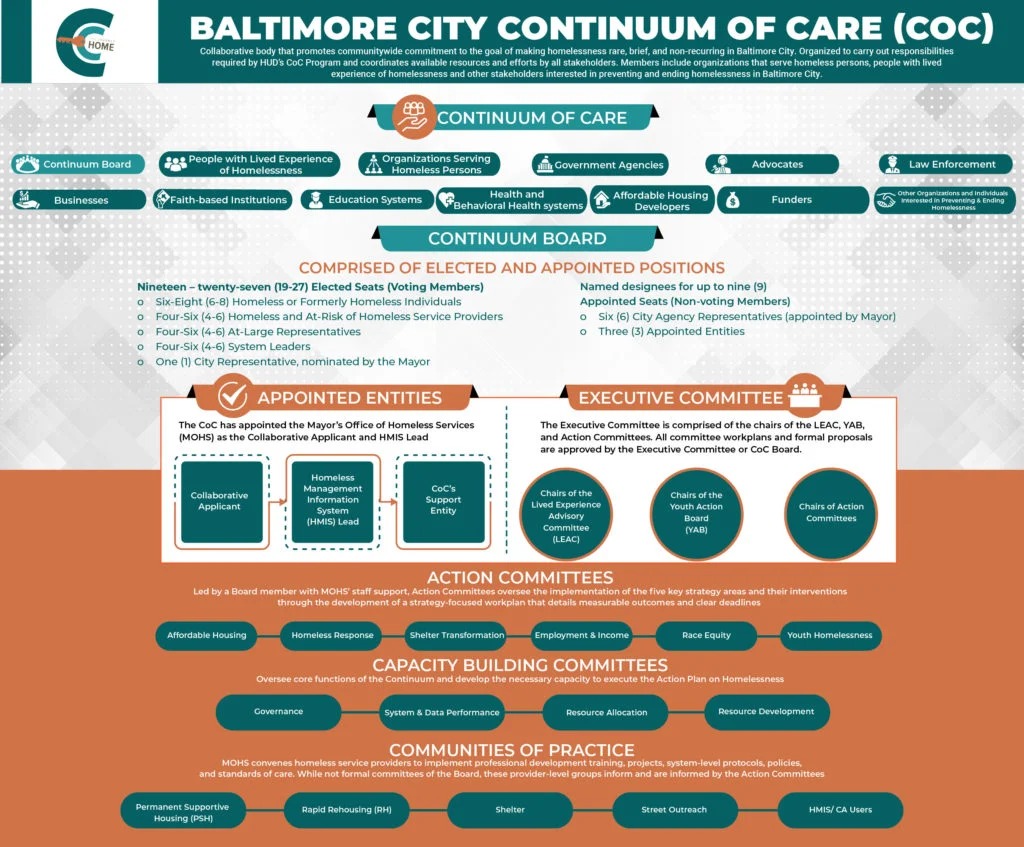 Continuum members include government agencies, organizations that serve homeless persons, people with lived experience of homelessness, funders, health and behavioral health systems, advocates, affordable housing developers, education systems, and other stakeholders interested in preventing and ending homelessness in Baltimore City.