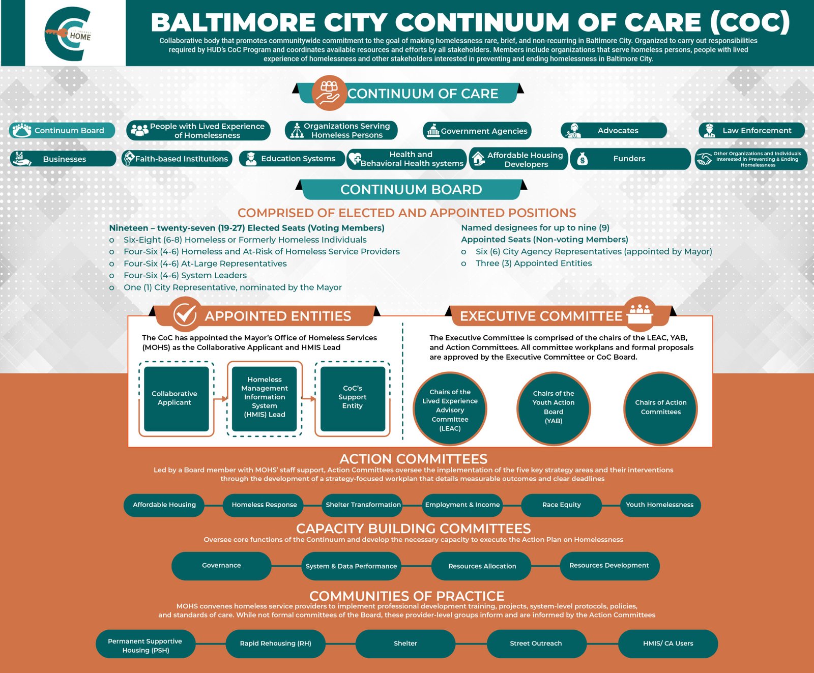 Baltimore City Continuum of care (CoC) is a U.S Department of Housing and Urban Development’s (HUD) Program that promotes community-wide commitment to the goal of making homelessness rare, brief, and non-recurring in Baltimore City. The CoC is organized to carry out responsibilities assigned by the Department of Housing and Urban Development’s (HUD) CoC Program and coordinates available resources and stakeholders’ efforts.